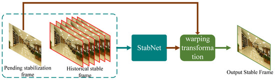 Traditional digital image stabilization methods mostly use offline algorithms to smooth the overall camera path through feature matching techniques. In contrast, StabNet is committed to achieving low-latency and real-time camera path smoothing. It neither explicitly presents the camera path nor relies on the information of future frames. Instead, it learns mesh transformations from historical stabilized frames and warps input frames to output stabilized results. The algorithm flow is shown in Figure 7.