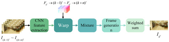 Liu et al. [57] proposed a frame synthesis algorithm named Hybrid, designed to achieve full-frame video stabilization. This approach effectively addresses issues such as noticeable distortion and significant boundary cropping common in existing stabilization methods. As illustrated in Figure 9, the Hybrid algorithm integrates four key components: a feature extractor, a warping layer, a frame generator with fusion functionality, and a final weighted summation step, collectively producing stabilized video output. The method’s core concept involves robustly fusing information from multiple adjacent frames. It first estimates dense warping fields from neighboring frames, then synthesizes stabilized frames by fusing these warped contents. A key feature of Hybrid is its deep learning-based hybrid spatial fusion technology, which can mitigate the impacts caused by inaccurate optical flow and fast-moving objects, and thus reduce the generation of artifacts. Instead of RGB frames, Hybrid extracts features via trained CNN, fuses aligned feature maps, and decodes to final color frames.
