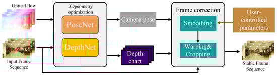 As depicted in Figure 10, this method’s implementation comprises two sequential stages. The initial 3D geometric optimization stage employs PoseNet and DepthNet to estimate the 3D camera trajectory and dense scene depth, respectively, from the input RGB frame sequence. Optical flow and the frame sequence itself serve as learning constraints for 3D scene reconstruction. The subsequent frame correction stage utilizes the estimated camera trajectory and scene depth to generate stabilized video through smoothed-trajectory view synthesis. During this process, users may adjust smoothing filter parameters to achieve varying stabilization intensities. Finally, warping and cropping operations produce the stabilized video output.