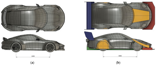 Figure 1. Side view comparison of the model: (a) base model configuration and (b) final aerodynamic kit configuration U9.