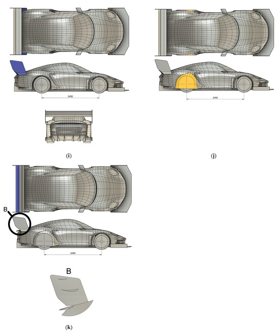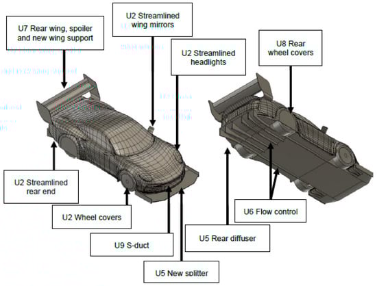 Figure 2a–k illustrates these key features in detail. Each figure highlights one of the eleven aerodynamic components as applied to the base model. Instead of displaying all U-variants, this figure set focuses on the modular building blocks that collectively form the optimized configurations. As a visual summary, Figure 3 presents the fully assembled configuration (U9). This model represents the final performance-optimized aerodynamic kit used in comparative CFD analysis.