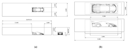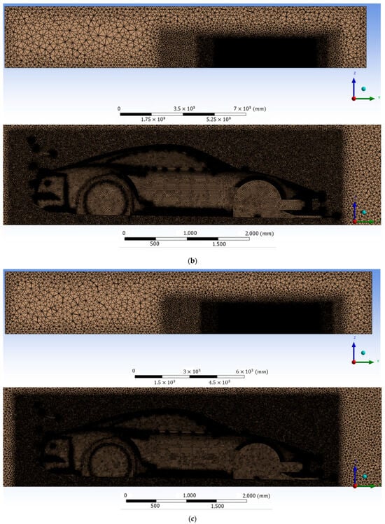 CAD geometry was exported in STEP (.stp) format and pre-processed in ANSYS SpaceClaim 2024 R2 to ensure watertight surfaces and eliminate non-manifold geometries. CFD simulations were performed using ANSYS Fluent 2024 R2. To minimize boundary effects on the vehicle and to observe the wake and freestream airflow, a large computational domain was defined. The car was positioned above a ground plane to reflect realistic ride heights. The domain clearance dimensions measured from the car were 3000 mm upstream, 12,000 mm downstream, 2000 mm laterally on each side, 2000 mm above, and 5 mm from the ground (Figure 4a). These dimensions ensured sufficient space for wake development and accurate pressure recovery.