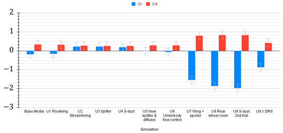 This metric was used to assess aerodynamic efficiency, particularly in configurations targeting high-speed performance. The effectiveness of each aerodynamic iteration was assessed in terms of the percentage change in C D and C L relative to the base model.