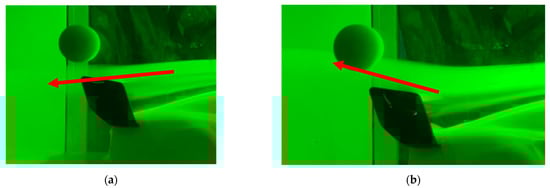 Figure 10. (a) Flow direction visualization over the model in U9.1 configuration with DRS (wings and spoiler AoA = 0°), and (b) flow direction visualization of the U9 configuration without DRS. (The red arrows show the direction of the stream.).