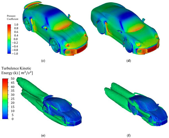 Figure 12. Flow visualization for U2: (a) Velocity contour of midplane for Base model, (b) velocity contour of midplane for U2, (c) pressure coefficient contour for Base model, (d) pressure coefficient contour for U2, (e) turbulence kinetic energy iso-surface at 20 m2/s2 for Base model, and (f) turbulence kinetic energy iso-surface at 20 m2/s2 for U2.