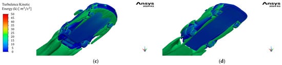 Figure 13. (a) Pressure coefficient contour of midplane for Base model, (b) pressure coefficient contour of midplane for U3, (c) turbulence kinetic energy iso-surface at 20 m2/s2 for Base model, and (d) turbulence kinetic energy iso-surface at 20 m2/s2 for U3.