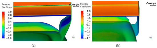Figure 16. (a) Contours illustrating the pressure variation on the top surfaces of the wing and the first support design, and (b) the second support design.