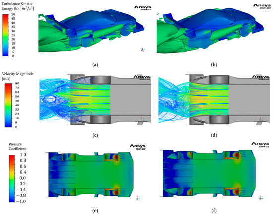 Figure 17. (a) Iso-surface of turbulence kinetic energy at 20 m2/s2 U8, (b) iso-surface of turbulence kinetic energy at 20 m2/s2 U8, (c) pathlines of air entering the diffuser for U10, (d) pathlines of air entering the diffuser for U10, (e) pressure coefficient contour of U7, and (f) pressure coefficient contour of U8.