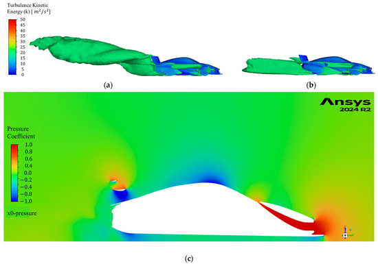 Figure 18. (a) Iso-surface of turbulence kinetic energy at 20 m2/s2 U8, (b) iso-surface of turbulence kinetic energy at 20 m2/s2 U9, and (c) pressure coefficient contour of midplane for U9.