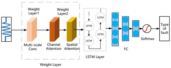 Benefit from its ability to generalize bias and extract feature, the convolutional neural network (CNN) has been developed for grid fault identification. In a previous study [], a CNN based on continuous wavelet transform and Bayesian-optimized error parameters was employed for fault identification and type classification. The frequency domain features were extracted by Short Time Fourier Transform (STFT), and the time-frequency feature image was constructed with the time-domain data, and then the DC-CNN was used for fault identification in []. However, the above method used manual feature extraction, which not only requires high feature extraction algorithms, but also increases the amount of computation and complicates the fault identification process. The feature extraction algorithms are demanding and increase the computational complexity. In fact, neural networks such as the CNN have the ability to extract features automatically and can be used to identify faults on raw data samples of three-phase voltage and current. Although in [,] the method of automatic feature extraction was also adopted, the fact that the data collected through the sensor has a high degree of temporal sequence and nonlinearity was ignored. In addition, the temporal feature extraction of the data is still insufficient to handle the power data collected by the sensors. LSTM is an efficient temporal feature extraction tool with powerful modeling capabilities to capture long-term dependencies, automatically learn time-dependent features, and effectively cope with the gradient vanishing problem, making it excellent in areas such as bearing fault detection and lifetime prediction. In [], the combination of a 1-D CNN and LSTM has been shown to outperform not only traditional methods but also other similar deep learning networks in classification and regression tasks. In addition, since the current limiting control of power electronic devices in AC/DC microgrids can weaken the fault features and make it difficult to recognize them directly, there is an urgent need to improve the capability of the CNN in feature extraction and fault detection to enhance the accuracy of capturing and recognizing the weak fault features and to improve the reliability and robustness of fault diagnosis [,,]. The proposed visual attention mechanism [,,,,], which simulates human cognition, has proven to be equally effective in extracting fault features. The attention mechanism can adaptively adjust weights to emphasize subtle changes in these features. Ukwuoma et al. integrated a multi-scale attention network into a deep graph neural network, incorporating spatial features during the training process, thereby enabling the model to gain a richer topological understanding from the data and exhibit stronger resilience to anomalous data and changing environments []. Overall, the attention mechanism provides a robust solution to these challenges by leveraging all the information in the feature graph to enhance overall model performance.