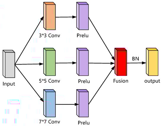 Weight Layer 1 employs parallel stacks of 3 × 3, 5 × 5, and 7 × 7 convolutional layers to extract local features from the input data. A feature fusion module then integrates the multi-scale information to produce an output with enhanced representational capacity. The structure of Weight Layer 1 is shown in Figure 2.