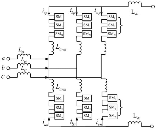The considered power converter in the AC/DC microgrid is a half-bridge MMC, as shown in Figure 5. The half-bridge submodule is made up of two IGBTs and a DC capacitor, controlled by complementary signals. This configuration generates two operating states, which can either commit or bypass the corresponding capacitors, producing a multilevel waveform output. The DC capacitors act as energy buffers and constant voltage sources.