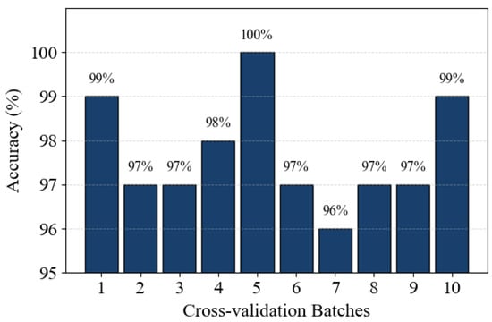 In the 10-fold cross-validation experiments [], the model achieves a maximum accuracy of 100% and a minimum accuracy of 96%, with an average accuracy of 97.77%. This indicates that the model’s performance is stable across different data subsets and demonstrates robustness against overfitting. Figure 6 illustrates the accuracy of the model on the test set for each fold.