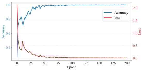 Dividing the training and test sets according to the ratio of 8:2, Figure 7 shows the trend of the model’s accuracy and loss during the training process. As the number of iterations increases, the model’s loss gradually decreases and approaches zero, while the accuracy on the training set rises steadily. Through extensive experimentation, we found that the model performs optimally after 200 iterations, achieving a training accuracy of 99.69% and a loss value of 0.019. On the test set, the model’s accuracy reaches 99.5%.