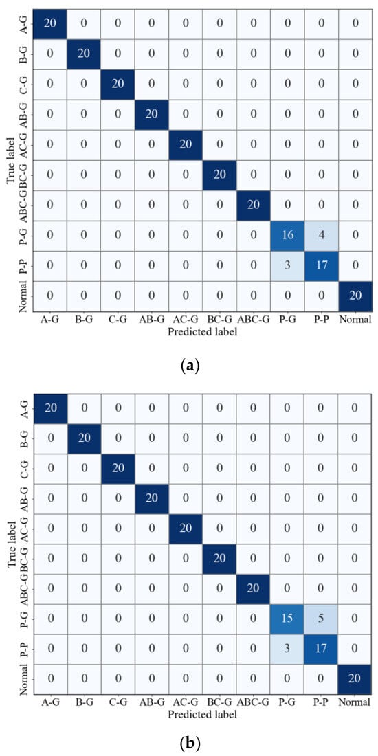 As shown in Table 3, the CNN-Attention-LSTM (CAL) model achieves the highest average accuracy on the test set, reaching 99.50%. The SVM and CNN models have comparable average accuracies, indicating that the attention mechanism enhances the upper limit of classification accuracy. The faults that the CNN and SVM cannot correctly deal with mainly include single-pole ground fault and pole-to-pole short circuits fault on the DC side. From the perspective of PCC, the current derived from single-pole ground and pole-to-pole short circuit is similar. Due to the limitation of model structure, the CNN and SVM cannot capture local information (e.g., anomalies in the signal at a certain moment), global information (e.g., overall signal trends), and the temporal correlations in the sequence data, so it is difficult to identify the faults with similar shapes.
