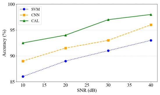 Based on the test results, it can be observed that as the noise intensity increases, the accuracy of the model on the test set gradually decreases. CAL achieves the highest accuracy of 98% at 40 dB and the lowest accuracy of 92.5% at 10 dB. As shown in Figure 9, CAL exhibits better noise robustness compared to the SVM and CNN. Therefore, CAL can effectively mitigate noise interference to a certain extent, demonstrating strong noise resistance and that it is well-suited to handle noise impacts in the data acquisition process of AC-DC microgrids.