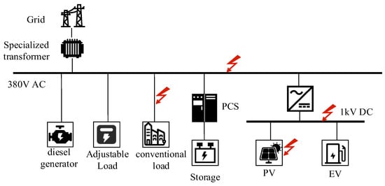 To verify the applicability of the proposed CAL, a park AC/DC microgrid in a specific region, as shown in Figure 10, is used as a test prototype. This topology encompasses electric vehicles (EVs), adjustable load, distributed photovoltaic systems, and energy storage devices. The specific parameters are detailed in Table 4. For the considered AC/DC microgrid, the following fault types are defined: (1) disconnection faults: disconnection of the fixed load; (2) short-circuit and grounding faults at different locations, including the 380 V AC bus and the 1 kV DC bus; and (3) power fluctuations due to equipment faults: abnormal PV output power. Specifically, for abnormal PV output power, two fluctuation ranges are defined: 20% increase and 20% decrease. Therefore, this test example establishes 13 fault types.