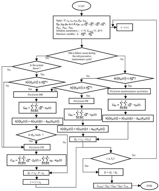 The second strategy is the focused preventive risk-based maintenance (F-PRPM) strategy, where maintenance actions are triggered only when the device failure rate exceeds a predefined risk threshold. This strategy does not incorporate the OM mechanism, nor does it account for RM. It is more suitable for rental scenarios with relatively simple system structures or lower fault-tolerance requirements. The maintenance cost function is expressed as follows: