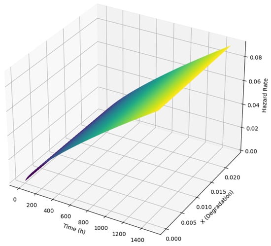 Figure 5 presents a three-dimensional surface generated by substituting the parameters of equipment into the Weibull PHM, illustrating how the failure rate of the equipment varies with time and the degradation level of its core components. The x-axis represents time (in hours), the y-axis indicates the degradation level of core components (modeled using a Gamma process), and the z-axis denotes the failure rate (governed by the Weibull-based PHM, influenced jointly by time and degradation). From the figure, it is observed that in the early stages, the failure rate remains relatively low even as time progresses, provided the degradation level is low. However, once the degradation becomes significant, the failure rate escalates exponentially. This nonlinear relationship underscores the urgency of implementing proactive maintenance in the later stages of equipment health deterioration. The figure provides intuitive guidance for maintenance planning, enabling practitioners to identify “risk escalation inflection points” and optimize inspection frequency and intervention timing, thereby improving system availability.