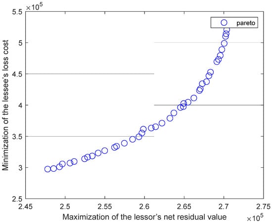 The NSGA-II algorithm promotes the formation of the Pareto front by favoring non-dominated individuals and encouraging diversity among solutions []. The parameter settings are as follows: population size = 80, generations = 100, crossover probability = 0.8, mutation probability = 0.3. As shown in Figure 6, the Pareto-optimal solutions of the multi-objective optimization problem are displayed, with objectives being the maximization of the lessor’s net residual value and the minimization of the lessee’s loss cost. The x-axis represents the lessor’s net residual value (in USD), and the y-axis denotes the lessee’s loss cost (in USD). All values are normalized to enhance visualization. The Pareto front exhibits a typical nonlinear trade-off between the two objectives, reflecting how different maintenance strategies affect the interests of both parties. Solutions near the lower-right corner achieve both high residual value and low customer loss, representing ideal strategies. This figure serves as a decision-support tool for maintenance planning negotiations, helping companies balance economic returns and customer satisfaction. For instance, if the firm prioritizes customer retention, it may select solutions with lower loss costs; conversely, a focus on asset recovery may favor strategies that maximize equipment residual value.