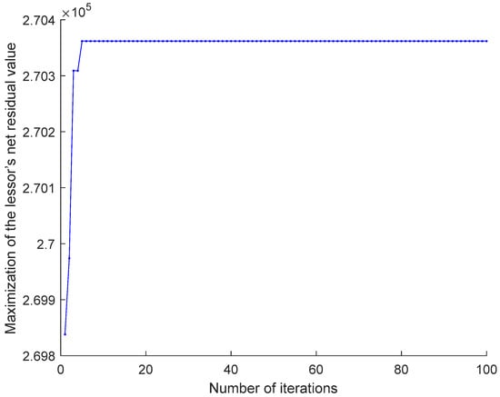 For any optimization problem, the objective function plays a crucial role, as it defines the goal of the optimization and directly influences the solution []. In the leasing system, the primary objective of the lessor is to maximize the net residual value, while the lessee’s main objective is to minimize the total loss cost. The optimization problem is to solve the following non-linear, mixed-integer, and stochastic model: