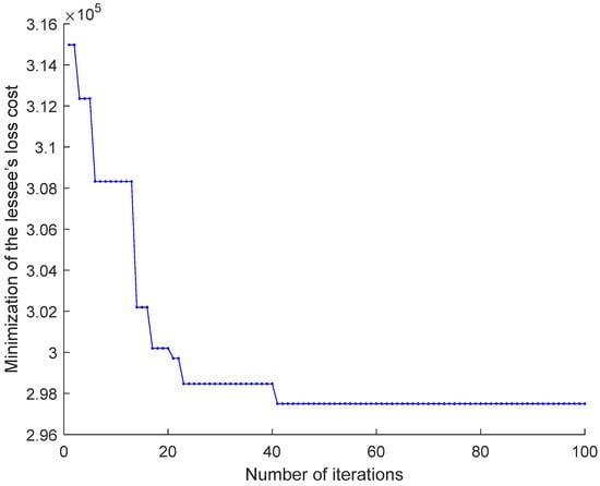 Figure 7 and Figure 8 present the evolutionary curves of the lessor’s net residual value and the lessee’s loss cost over the course of the optimization, respectively. As seen in the figures, both objectives stabilize around the 40th generation, indicating that the NSGA-II algorithm exhibits good convergence and stability. This suggests that the model can produce consistent and repeatable outputs in practical deployment, contributing to the reliability of decision implementation. Furthermore, the evolution process can assist users in evaluating algorithm performance under different parameter settings, serving as a basis for future parameter tuning or sensitivity analysis.