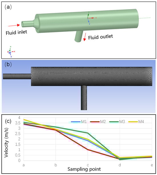 In order to ensure that the quality of the mesh does not affect the calculation results as much as possible, it is necessary to verify the mesh irrelevance of the generated mesh. The specific method is as follows: five sampling points a, b, c, d, e are set at different locations on the cross-section of Z = 1200 m. The velocities at the locations of the five sampling points on the mesh are verified by changing the number of meshes to detection to observe the effect of grid changes on the computational accuracy of different nodes. Four different numbers of grids are used during the validation period, numbered from low to high according to the number of grids, which are M1, M2, M3, and M4 and the corresponding numbers of grids for different models are 136,340, 233,627, 283,302, and 324,099, respectively. As shown in Figure 2c, the flow velocities of the sampling points on the cross section of Z = 1200 m in the models M1~M4 are compared, and finally the total number of grid cells is chosen to be 324,099. M4 grid with a total number of grid cells of 324,099 is selected for subsequent simulations.
