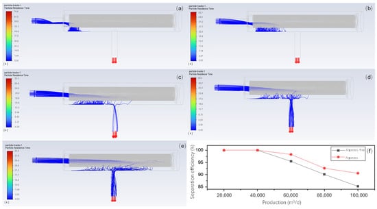 Particle trajectories (with water) in the different production rate: (a) 20,000 m3/d; (b) 40,000 m3/d; (c) 60,000 m3/d; (d) 80,000 m3/d; (e) 100,000 m3/d; (f) separation performance.
