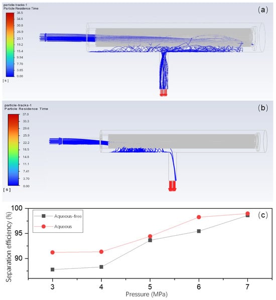 Particle trajectories (with water) in the different operating pressure: (a) 3 MPa; (b) 7 MPa; (c) separation performance.