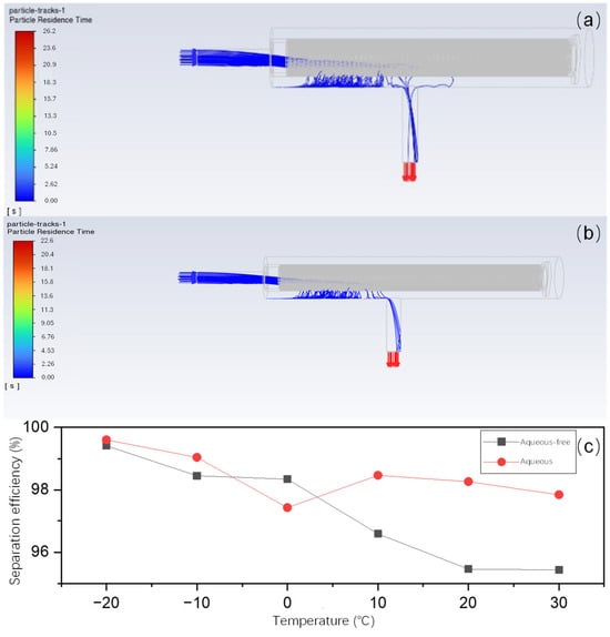 Particle trajectories in the different temperature: (a) 10 °C; (b) −10 °C; (c) separation performance.