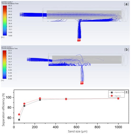 Particle trajectory (with water) in the different sand size: (a) 50 µm; (b) 1000 µm; (c) separation performance.