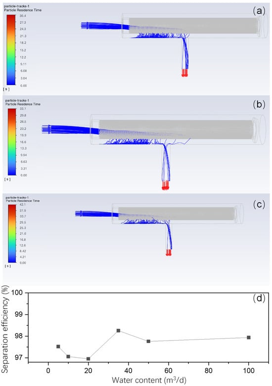 Under the conditions of water content and no water content, the inlet flow rate of the desander is set as 2~10 × 104 m3/d. The particle trajectory of the internal flow field of the desander is shown in Figure 4, and the separation efficiency of the desander is analyzed according to the Fluent simulation results. The Fluent simulation results show that there is a close relationship between the desander inlet flow rate and the separation efficiency. When the inlet flow rate increases, the fluid flow rate increases so that the residence time of the water inside the desander is greatly shortened [26]. The shorter residence time leads to insufficient time for the sand particles to settle, especially for the fine particles, which cannot be effectively settled within a limited time, and thus fail to be completely separated.