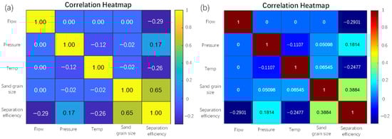 For the two conditions of water content and no water content, the parameter correlation analysis was carried out using 21 sets of data on the separation efficiency of the desander with different production, pressure, temperature, and grain size conditions in this work [7]. The heat map of the correlation coefficient of the separation efficiency is shown in Figure 9 (correlation threshold: |r| > 0.7 (high), 0.3 < |r| ≤ 0.7 (medium), |r| ≤ 0.3 (low)). Filter desander separation efficiency is affected by gas production, pressure, temperature, gravel particle size, water content, and other factors. After analysis, it can be seen that whether in the conditions of water content or not, the parameters of production, pressure, temperature, and particle size will have an effect on the separation efficiency of the desander. And the degree of influence shows a certain law: the degree of influence of the particle size is the largest, followed by the production, followed by the temperature, and the degree of influence of the pressure is relatively the smallest.