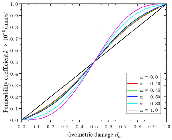 where is the seepage evolution factor, is the permeability coefficient of the intact zone, is the permeability coefficient of the completely fractured domain, and is an interpenetrating parameter, reflecting the sensitivity of permeability growth due to spatial discontinuity. Figure 2 shows the variation in permeability evolution with respect to geometric damage for different interpenetrating parameters. When , the permeability evolves linearly with the geometric damage.