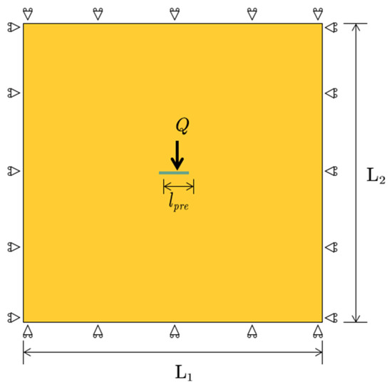 Shown in Figure 3 are the geometry, injection, and constrained boundary conditions of the KGD hydraulic fracturing problem. Both and are 10.0 m, and the prescribed displacement and pressure of the surrounding boundaries are set to zero (i.e., permeable boundaries). The pre-existing crack length , and the water injection rate is /s, while the time step . The parameters p and q in the energetic degradation function [30] are set to 3 and 4, respectively, while the interpenetrating parameter is set to 0.4, and the other relevant material parameters are shown in Table 1.