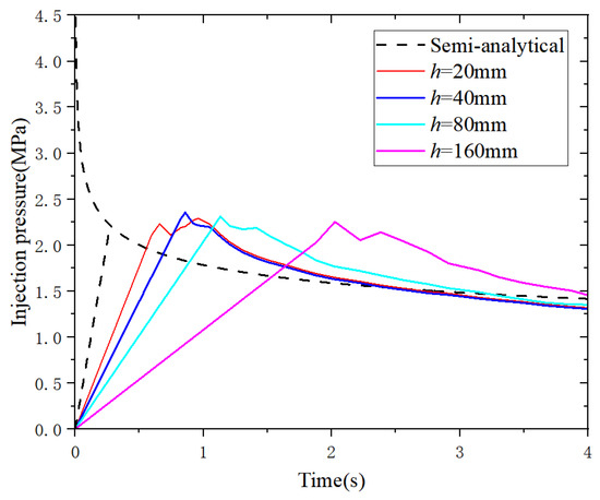 To investigate the convergence of the extended NMMD model, we first consider different sizes of finite element discretizations in solving Equation (23). In view of the deformation gradient at the crack front being too large during hydraulic fracturing, it is required that the mesh in the fracturing area be sufficiently dense to accurately track the hydraulic fracturing process. Therefore, this paper uses four different grid sizes for encryption in the potential crack propagation domain, i.e., h = 20 mm, 40 mm, 60 mm and 160 mm. Extracted from the numerical results of the extended NMMD model, the injection pressures within the crack under different mesh densities are shown in Figure 4. It can be seen that the numerical solution of the injection pressure gradually converges to the semi-analytical solution, namely Equations (24) and (25), as the minimum mesh size tends to zero. It should be pointed out that the linear component in the semi-analytical solution is the actual injection pressure path prior to hydraulic crack propagation. In other words, these results directly demonstrate that the extended NMMD model is robust and reliable in simulating the hydraulic fracturing process.