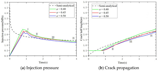 To this end, three cases of and are considered. Shown in Figure 5 are the corresponding variations in injection pressure within crack interior and crack propagation length with respect to injection time. As can be seen in Figure 5a, before the injection pressure reaches its peak value, the interpenetrating parameter would control the increasing rate of injection pressure. Recalling the variation in permeability evolution factor with geometry-based damage in Figure 2, minor damages are insufficient to cause a significant increase in the permeability coefficient at a small interpenetrating parameter, resulting in the injection pressure increases at a faster rate when the value of the interpenetrating parameter is small. After the peak values of injection pressure, the larger the value of the interpenetrating parameters input, the smaller the response of the injection pressure output. In Figure 5b, on the other hand, one clearly sees that crack propagation lengths obtained using the extended NMMD model are very closed to the semi-analytical one, except for the stage before the critical cracking moment (about 0.8 s). This is because during the derivation of the semi-analytical solution, the time required for fluid injection was neglected, resulting in an infinite pressure at the beginning of the injection (see Figure 5a), which contradicts the real physical situation. In contrast, the extended NMMD model can capture actual behavior that occurs in the hydraulic crack initiation if and only if the injection pressure reaches its peak.