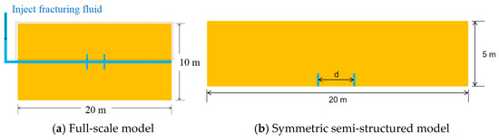 The modified NMMD model based on constructed seepage–stress coupling was used to simulate the fracturing problem of multiperforated horizontal wells. The calculation model for the synchronous fracturing of multiperforated horizontal wells is shown in Figure 8a. Due to its geometric symmetry, we take the half structure for calculation, as shown in Figure 8b. The length of the model is , the height is , and the displacement and pressure on the boundary are both 0.0. The two preset crack lengths are all , with a spacing of d. The calculation is carried out using four-nodal isoparameter elements, with the main material parameters set as follows: elastic modulus E = 24.0 GPa, Poisson’s ratio , permeability coefficient in the undamaged area mm/s, permeability coefficient in the completely damaged area mm/s, viscosity coefficient , Biot coefficient , and porosity . The main calculation parameters are set as follows: energy degradation parameters p, q, and are 4, 15, and 2000, respectively; seepage evolution parameter ; critical elongation rate ; and time incremental step . The injection rate of fracturing fluid is m2/s.