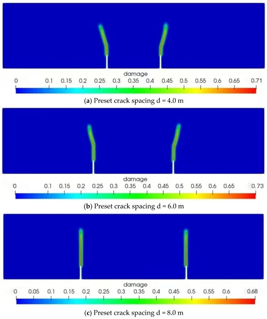 The damage distribution of three different preset crack spacings after 2.0 s of liquid injection is shown in Figure 9. It can be seen that when the crack spacing is 4.0 m, the crack first expands along the preset direction by approximately 0.65 m and then expands outward at a 22° deflection angle. When the crack spacing is 6.0 m, the crack first expands along the preset direction by approximately 1.22 m and then expands outward at a deviation angle of 15°. When the crack spacing is 8.0 m, the cracks always propagate along the predetermined direction without deflection.