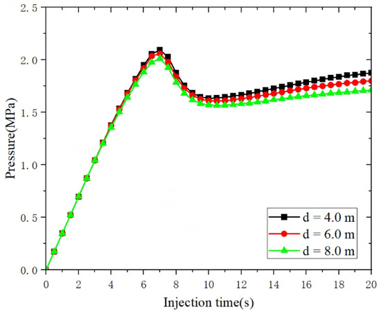 The pressure at the preset crack tip with the injection time for different crack spacings.