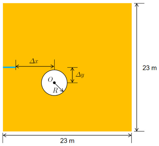 In practical engineering, the problem of natural pores may be encountered during the hydraulic fracturing process of preset cracks. A two-dimensional model is shown in Figure 11. The model is a square with a side length of , and the preset crack length is . There is a natural hole within the square. The difference in the horizontal axis between the circular center and the preset crack tip is , and the corresponding difference in the vertical axis is . All four edges are fixed, and they are all permeable boundaries, that is, with a pressure of 0.0. The calculation is carried out using four-nodal isoparameter elements. The main material parameters are set as follows: elastic modulus , Poisson’s ratio , permeability coefficient in the undamaged area mm/s, permeability coefficient in the completely damaged area mm/s, viscosity coefficient , Biot coefficient , and porosity . The main calculation parameters are set as follows: energy degradation parameters p, q, and are 4, 15, and 2000, respectively; seepage evolution parameter ; critical elongation rate ; and time step . The injection rate of the fracturing fluid is m2/s.