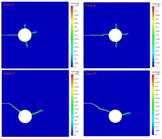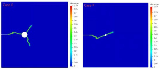 To explore the influence of natural pores on the hydraulic fracturing path, the six cases listed in Table 2 were chosen according to the arrangement of the holes and their position and size. With the injection of fracturing fluid, after a period of time, the preset crack expands to intersect with the natural pores and further expands. The damage distributions under various cases are shown in Figure 12.