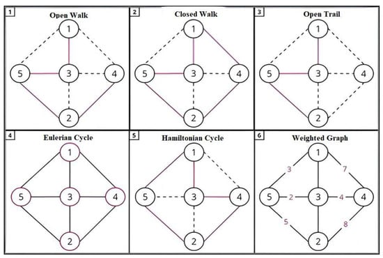 Example—graph theory. (1) Open Walk—A sequence of vertices and edges where the first and last vertex can be different, and vertices and edges may be repeated. (2) Closed Walk—A sequence that starts and ends at the same vertex, allowing repetition of vertices and edges. (3) Open Trail—A sequence of vertices and edges where edges are not repeated, but vertices may be. The first and last vertex can be different. (4) Eulerian Cycle—A cycle that traverses every edge of the graph exactly once and returns to the starting vertex. (5) Hamiltonian Cycle—A cycle that visits every vertex of the graph exactly once and returns to the starting vertex. (6) Weighted Graph—A graph where each edge has an associated weight, representing cost, distance, or another metric. Source: authors, 2024.