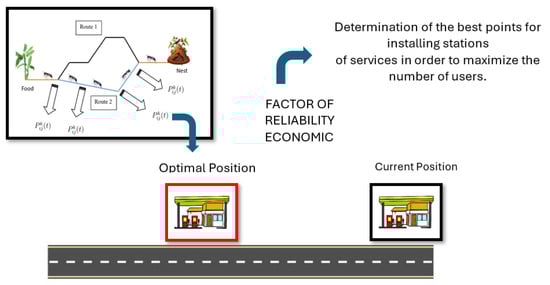 The Ant Colony Optimization (ACO) metaheuristic, a nature-inspired approach, emulates the collective behavior of ants searching for food. In this process, ants leave their anthill (starting point) and navigate toward food sources, optimizing their paths by evaluating multiple routes through indirect communication via pheromones, as depicted in Figure 2. The image demonstrates the use of the ACO metaheuristic to identify the optimal locations for service stations along highways, aiming to maximize user reach while balancing economic reliability factors by comparing the current and ideal positions.