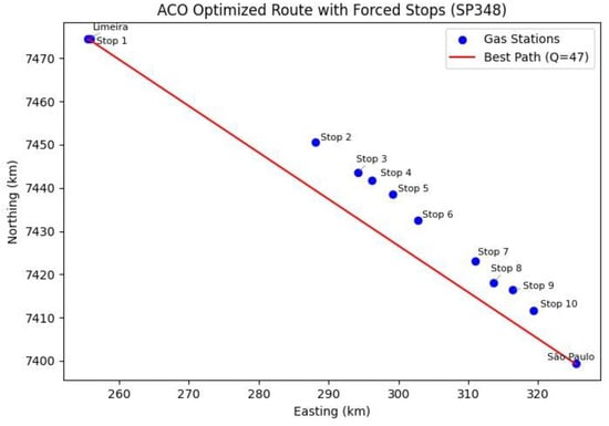This difference arises because the optimized distance is calculated using Euclidean distances based on UTM coordinates, which only consider straight-line measurements between given points. As a result, the ACO algorithm underestimates the actual length of the SP-348 highway. This suggests two possible explanations: (1) the provided waypoints represent only a partial segment of the highway, or (2) the ACO algorithm prioritizes the shortest possible route since it assumes that vehicles have sufficient fuel autonomy and do not require additional detours for refueling.