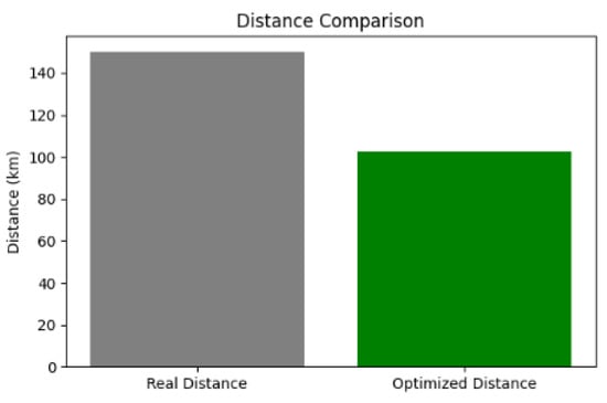 The x-axis categorizes these two distances as follows: “Real Distance”, which corresponds to approximately 150 km, and “Optimized Distance”, which is significantly shorter (e.g., 76.12 km). The y-axis measures distance in kilometers.