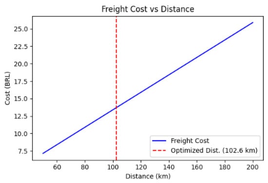 Figure 8 relates the traveled distance to the freight cost. The blue curve represents the variation in transportation costs as the distance increases, following a fitted linear model. The vertical red line marks the distance optimized by ACO, indicating where the proposed solution falls within the cost function. This graph reinforces that, despite a slight increase in total distance, optimization can lead to cost reductions by avoiding excessive fuel expenses and unplanned stoppages.