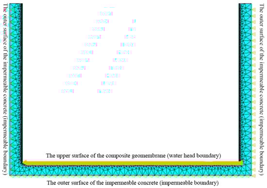 The permeability coefficient, a finite element calculation parameter that represents the material’s ability to transmit fluid, is determined during the engineering design phase. In this project, the permeability coefficient of the composite geomembrane is 1.0 × 10−11 cm/s, while that of the reinforced concrete structure in the cell pool is 3.0 × 10−8 cm/s.