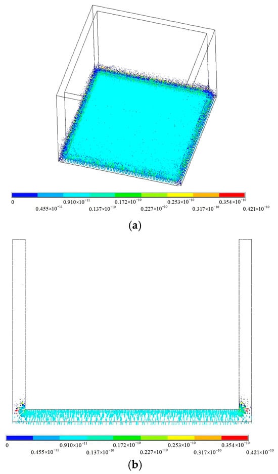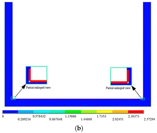 Figure 6 presents the vector diagram of the percolation velocity for hazardous waste leachate. As illustrated in the diagram, the percolation velocity of leachate within the unit pool of a rigid landfill site is notably low, with the distribution of the percolation velocity being relatively uniform across most areas of the composite geomembrane on the bottom plate. During the process of leachate percolation through the composite geomembrane, the fluid encounters substantial resistance. This resistance arises from the physical and chemical properties of the geomembrane materials, such as their density, porosity, and impermeability. As a consequence of this resistance, the percolation velocity is reduced.