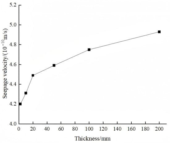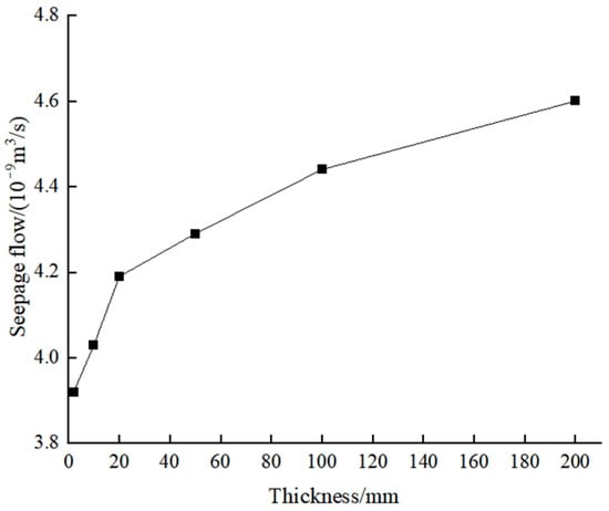 In this paper, the permeability of a composite geomembrane at its actual thickness (i.e., 2 mm) is first calculated. Subsequently, five scenarios are introduced to scale up the thickness by factors of 5, 10, 25, 50, and 100 times, leading to thicknesses of 10 mm, 20 mm, 50 mm, 100 mm, and 200 mm, respectively.